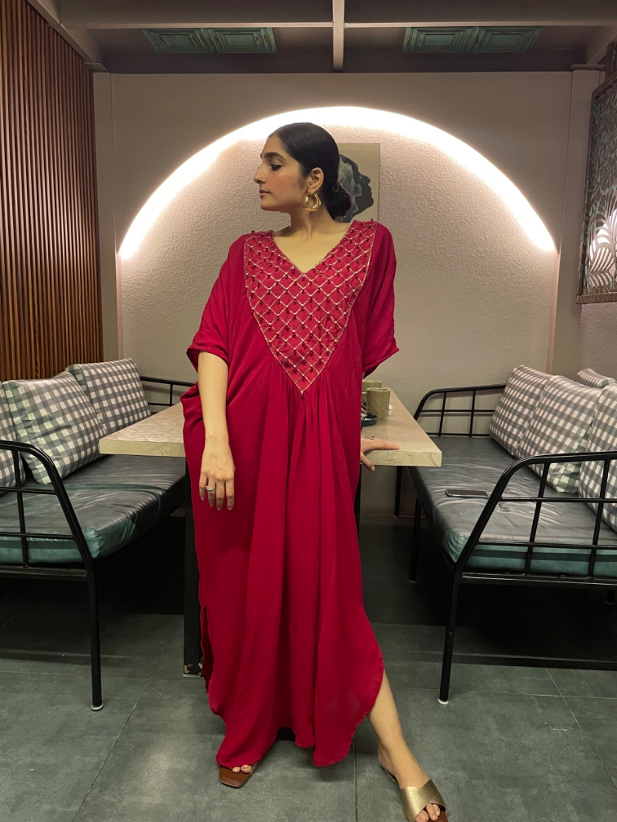 Absolutely yes flaming in this exquisite size less kaftan embroidered with Crystals and pearls over the yoke..