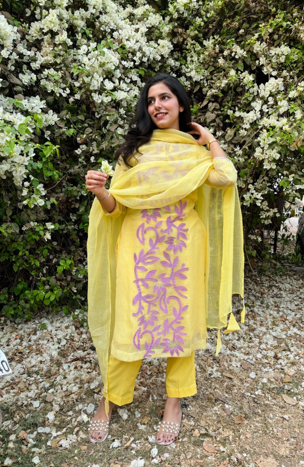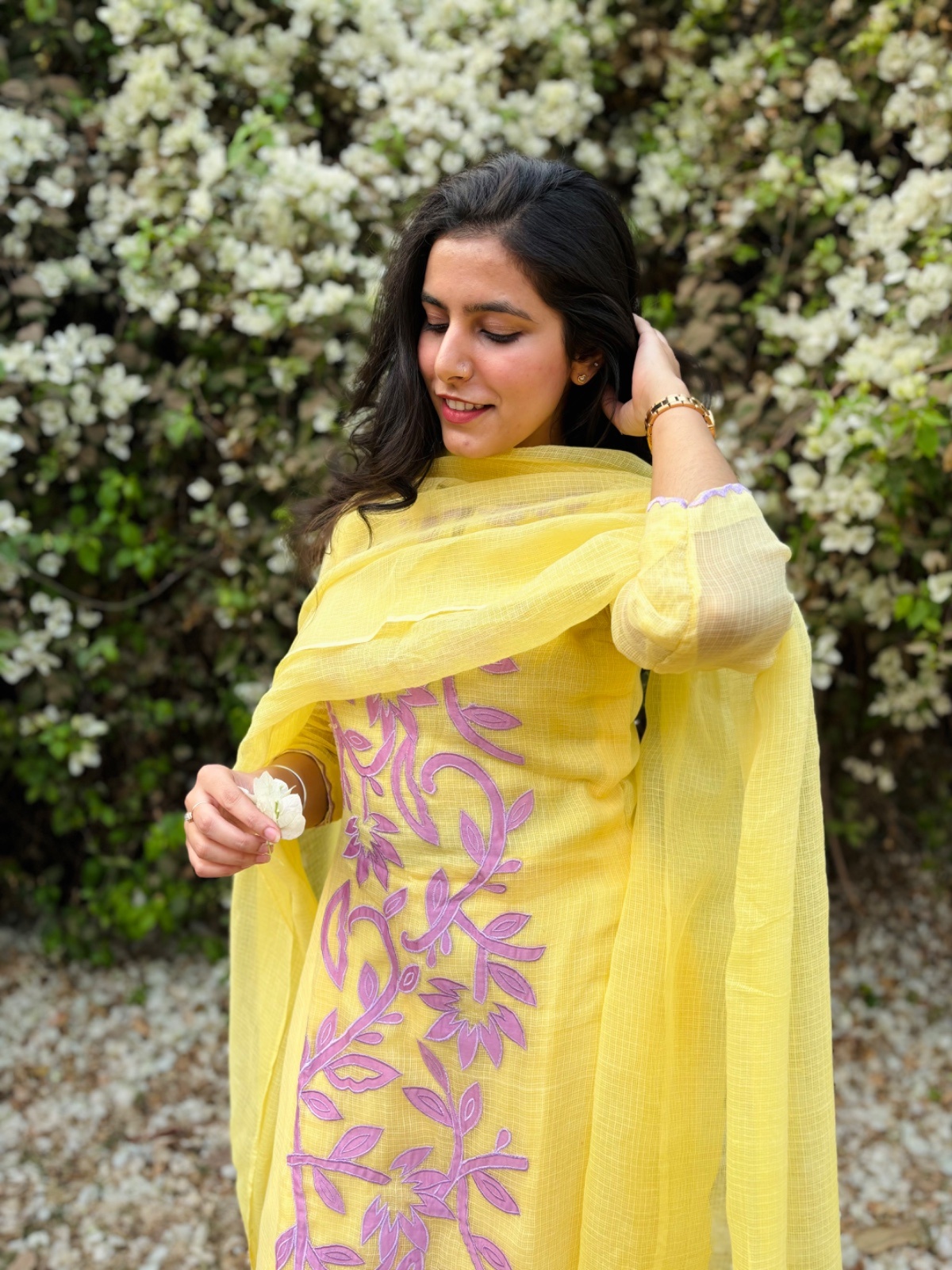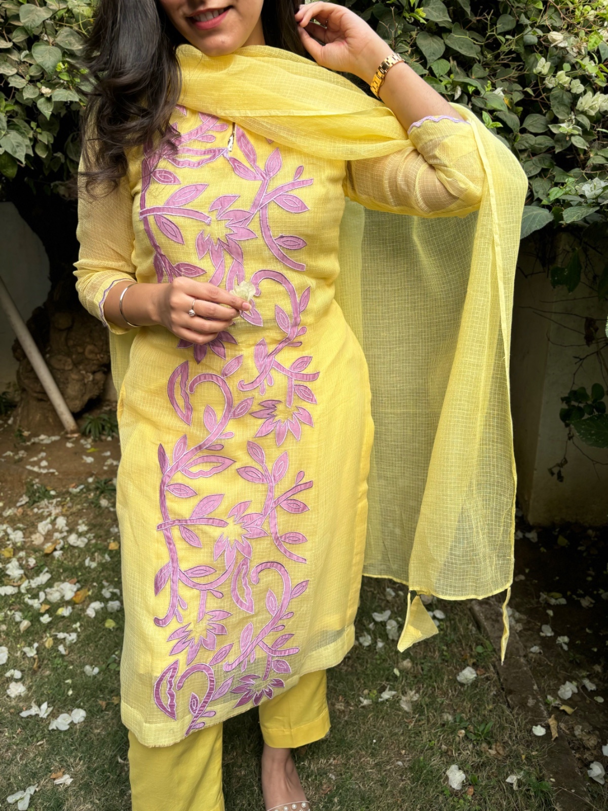 Super delicate Kota Doria adorned with vibrant appliqué work in soft hues.