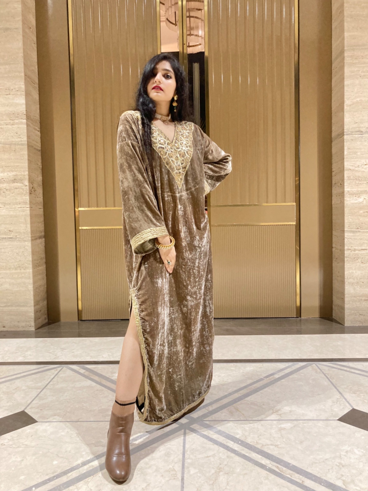 Stay cozy in style with our luxurious velvet silk kaftan — perfect for winter. Adorned with a blend of traditional mirror work and modern gota detailing, it’s where comfort meets culture. Ideal for festive evenings or lounging in elegance.