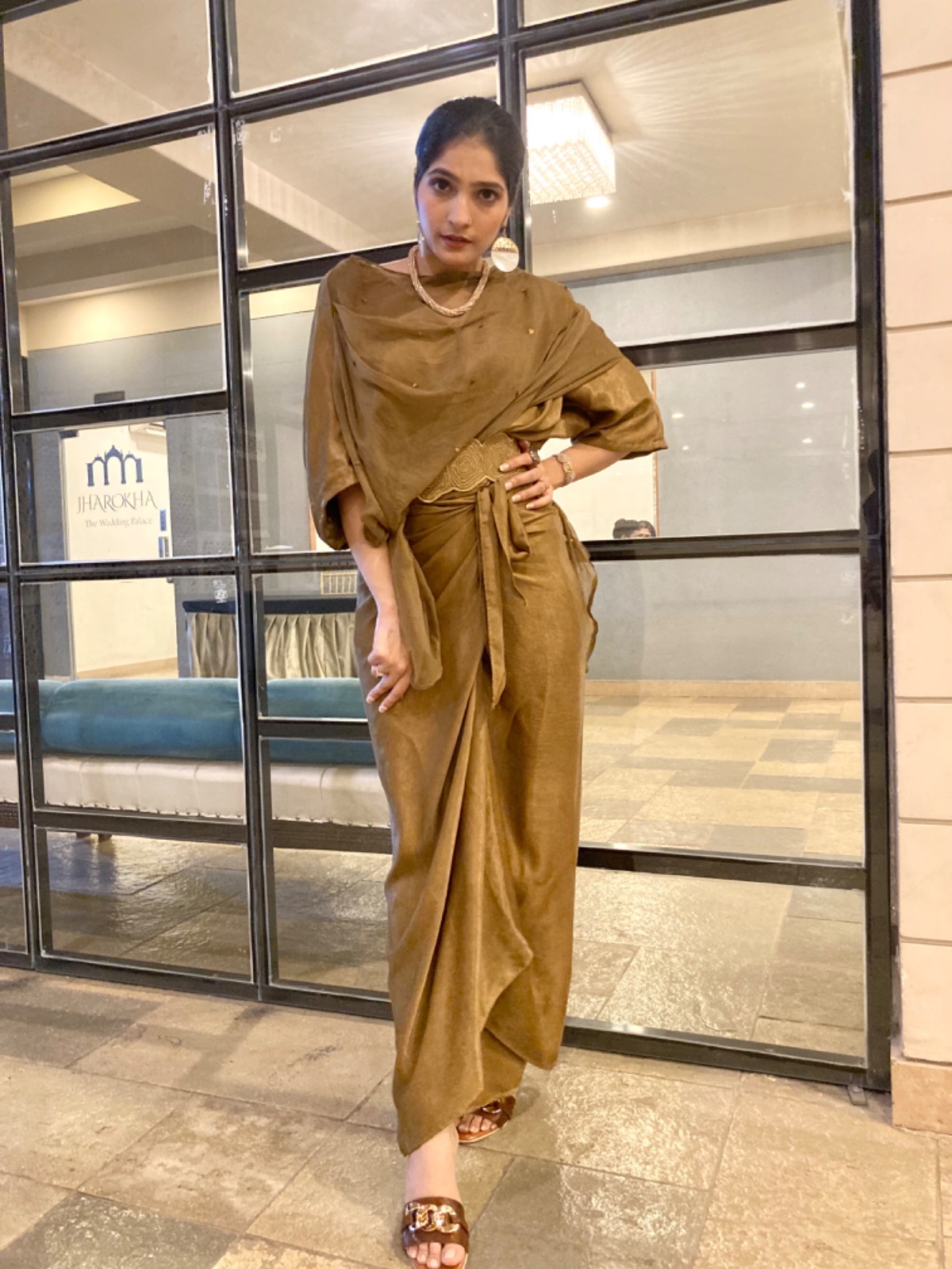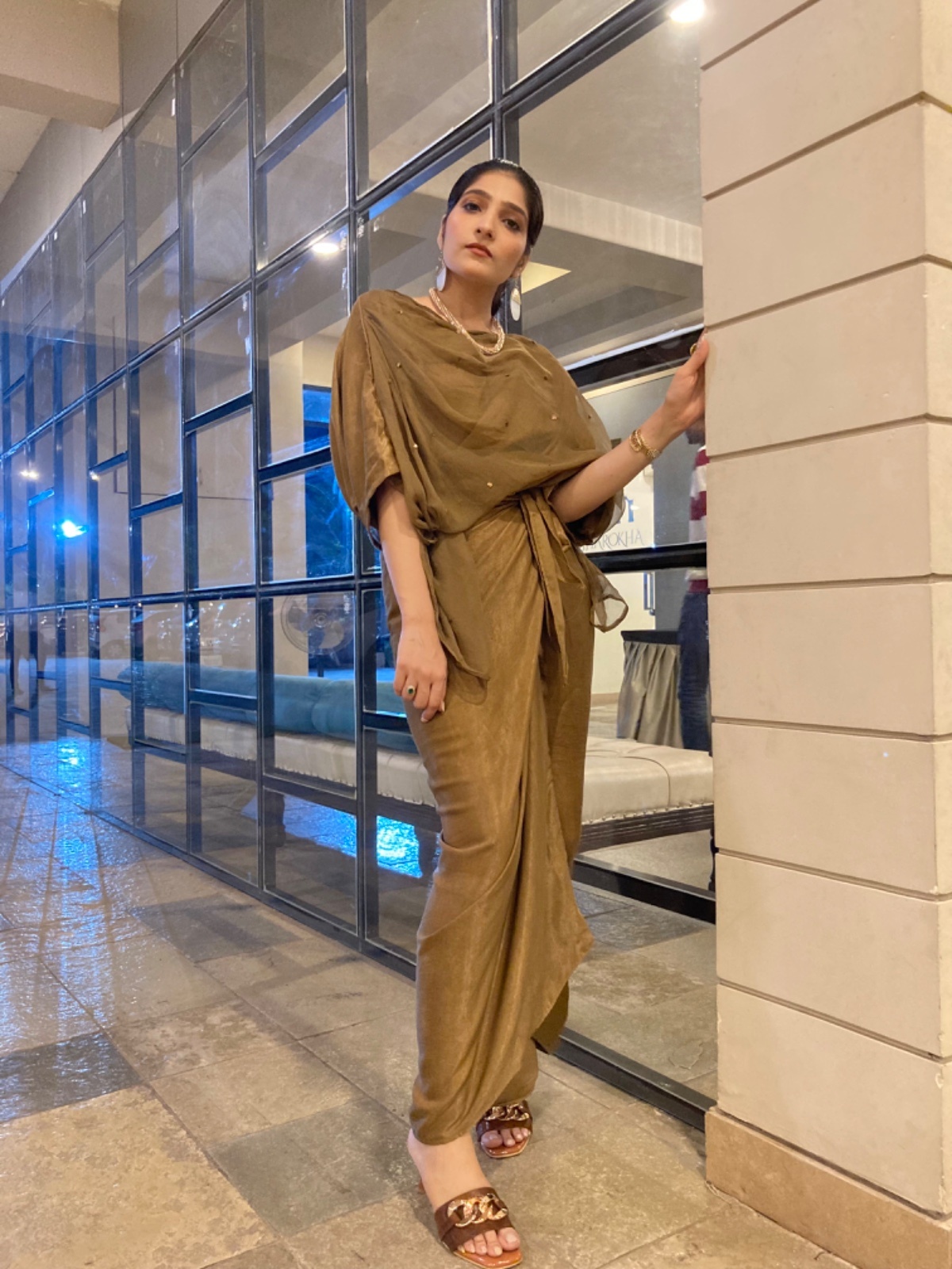 Perfect for high-end evening soirées or a chic day out in the city, this set offers versatility with a touch of drama. The asymmetrical draping adds movement, while the soft sheen gives it that after-dark allure. A statement belt cinches the waist just right—bringing the whole look together with bold elegance. Pair it with minimal heels and statement jewelry to complete the look.